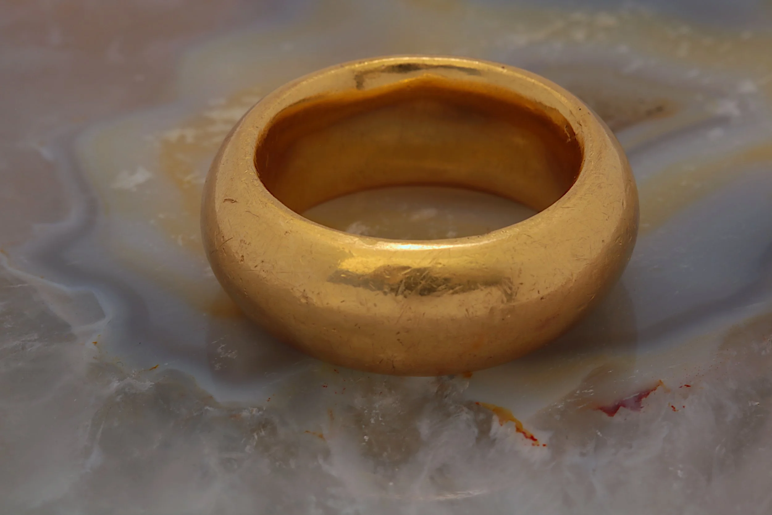 A minimalist yet bold statement, this plain band is anything but ordinary. Crafted in 22K gold, it weighs nearly an ounce, making it a substantial and luxurious piece. Designed for a client who appreciates the feel of heavy jewelry, it embodies both simplicity and opulence.