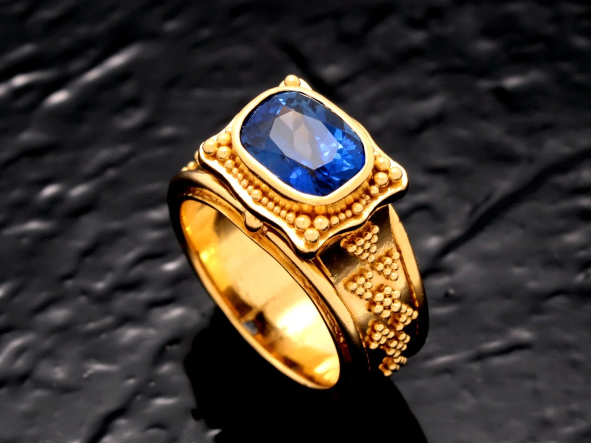A commission inspired by antique and period jewelry. This rich 18k gold ring features hand fabricated and delicately hand-placed granulation details and was crafted without solder using ancient techniques. The platform-style setting highlights a rare, untreated 3.68-carat Ceylon sapphire of exceptional deep blue color.