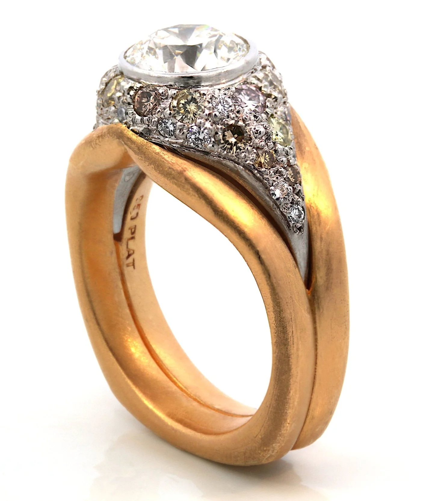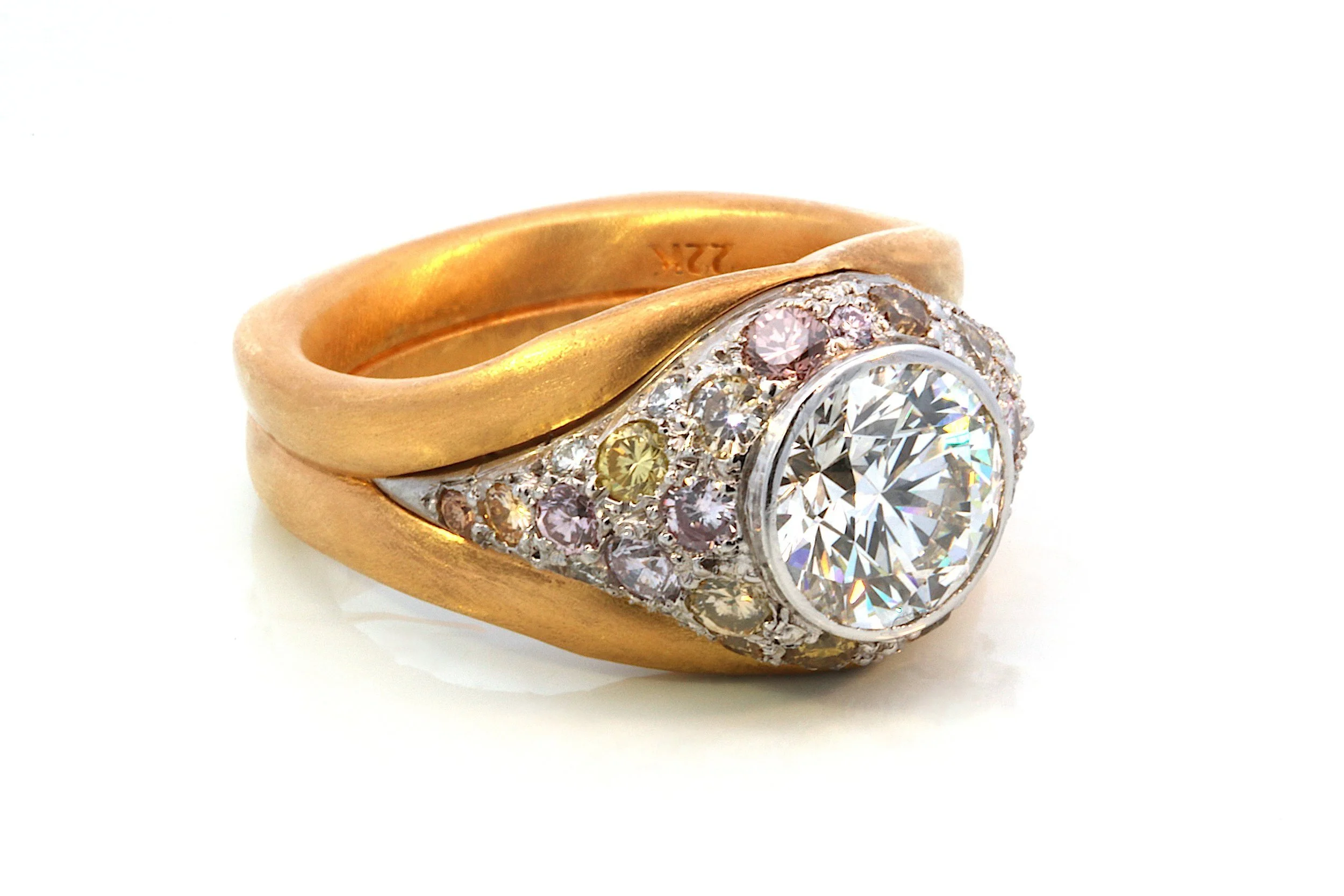 This commissioned ring showcases a stunning two-carat fine diamond at its center, bezel-set in platinum for a sleek yet substantial presence. Surrounding it, nearly a carat of natural fancy-colored diamonds—ranging from intense pinks to vivid yellows and warm champagnes—are intricately set in platinum, creating a rich, textured effect. The softly brushed gold band curves fluidly around the setting, lending an organic, sculptural quality to the piece. A beautifully unconventional take on a classic diamond ring.