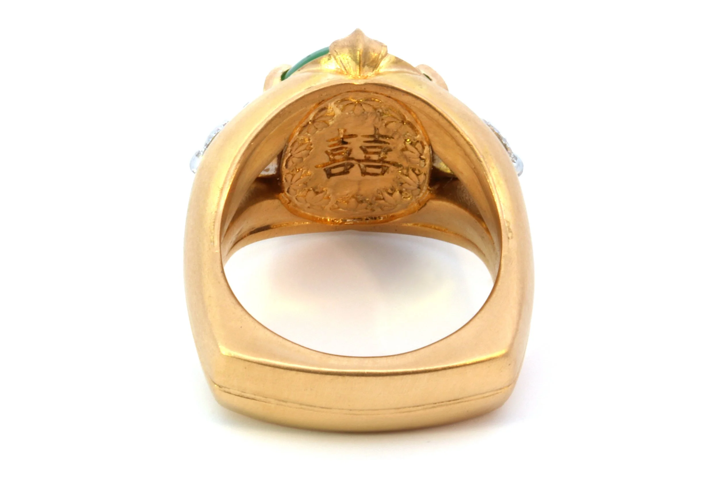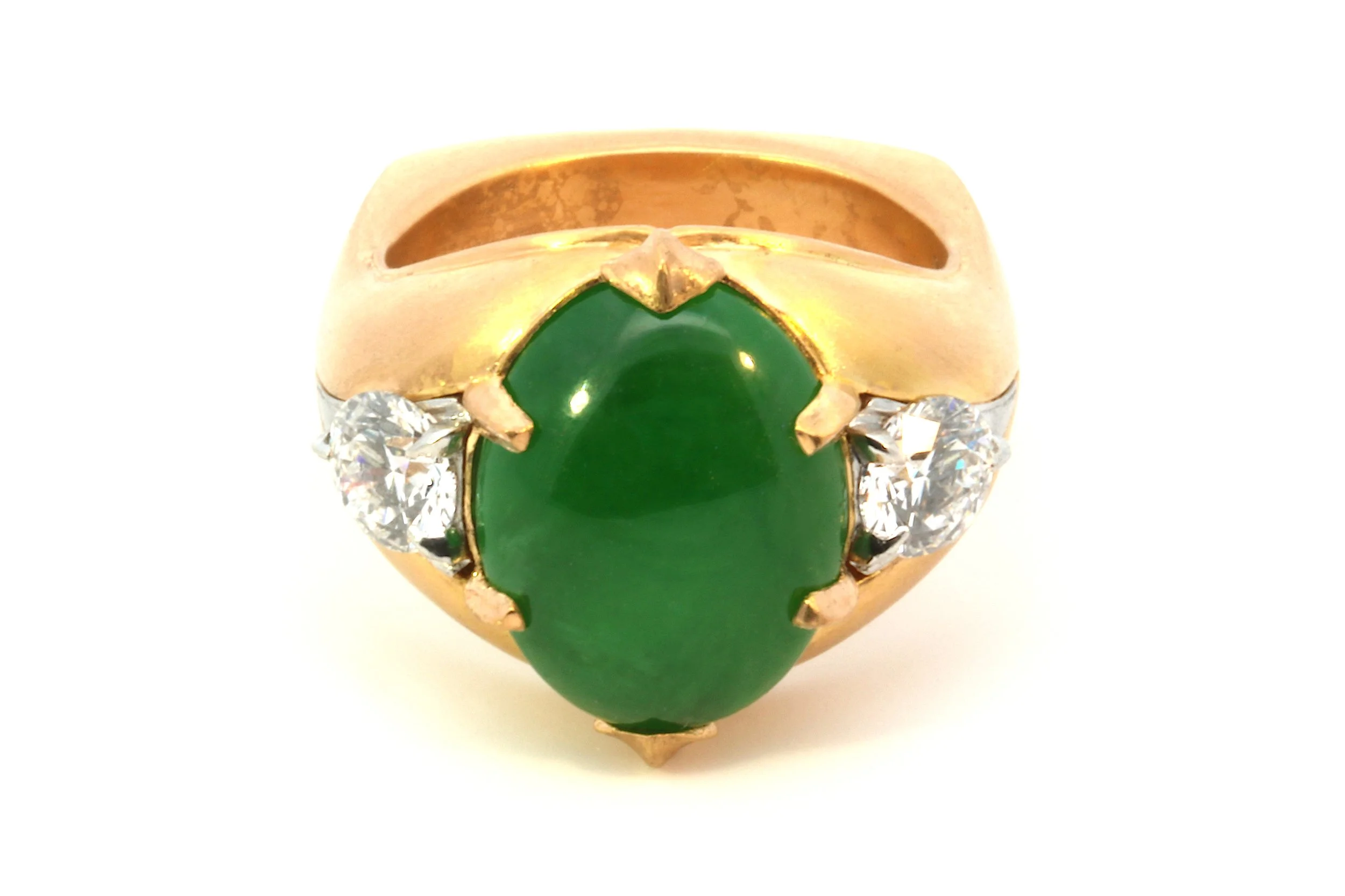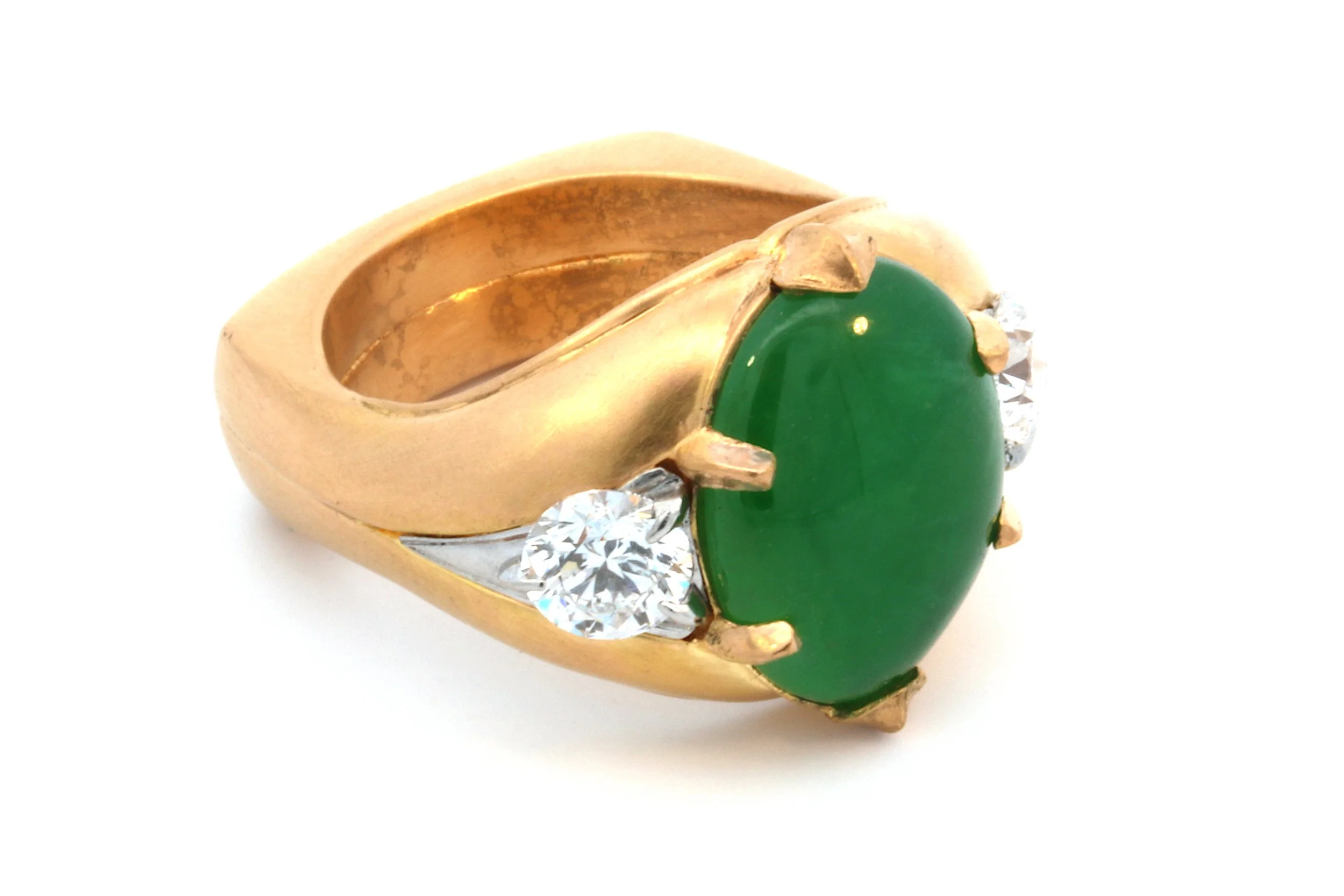 This 22K gold and platinum ring was a special commission, designed around an exceptional Burmese jadeite—completely natural and untreated. Its deep green color speaks for itself, a rare find that needs no enhancement. On either side, near-flawless diamonds, about a carat each, are set in platinum. They’re so precisely matched that they differ by only one-hundredth of a millimeter in a single dimension—essentially perfect.