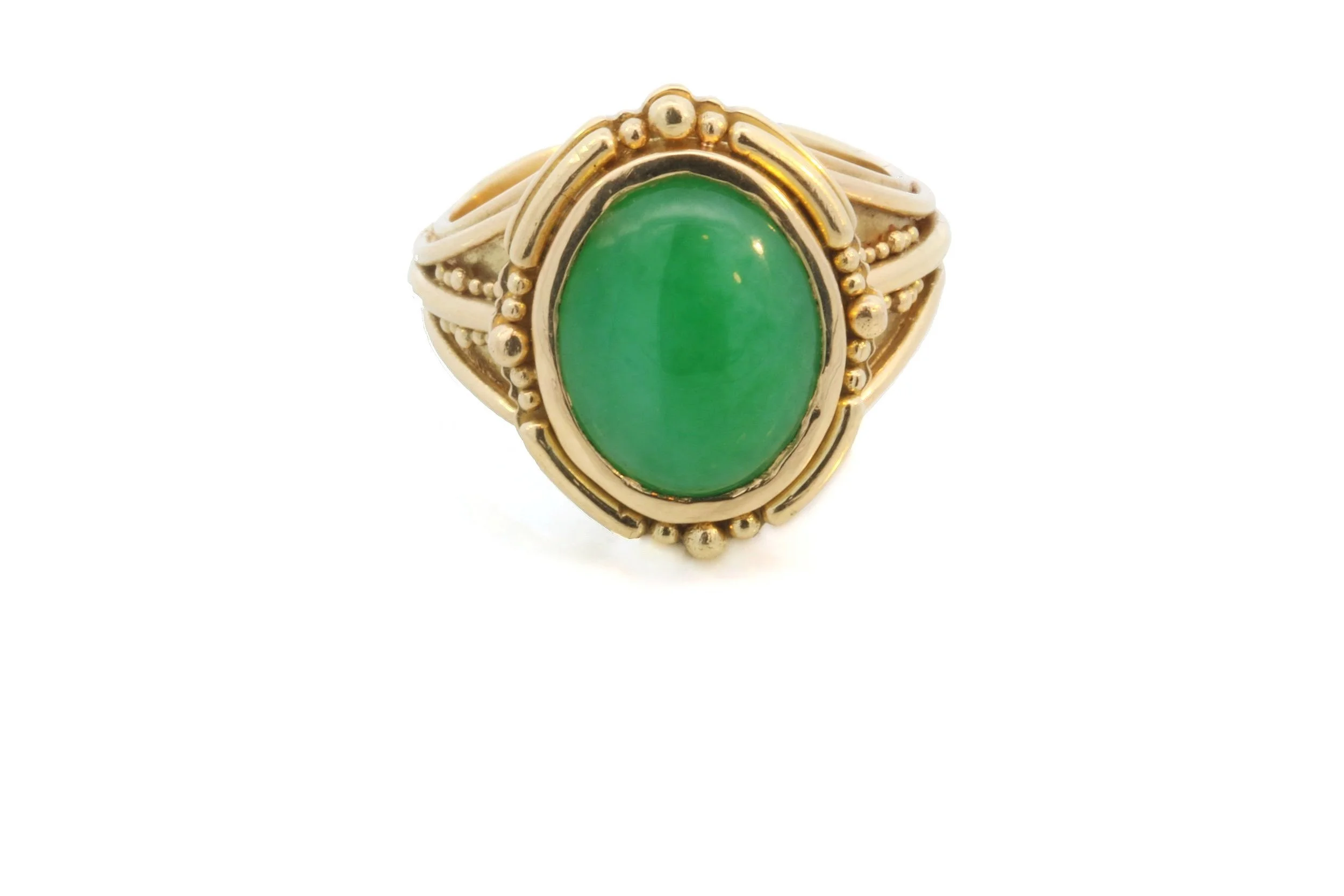 This commissioned piece was designed with care and crafted with precision to highlight a vibrant apple-green jadeite—an untreated, highly coveted variety prized for its luminous translucency and depth of color. The gemstone is set in a meticulously hand-fabricated 18K gold ring, featuring delicate granulation work, an ancient technique that adds rich texture around the stone. A refined take on the platform ring style, its subtly elevated setting creates a striking dimensional effect, making the glowing jadeite the true focal point.
