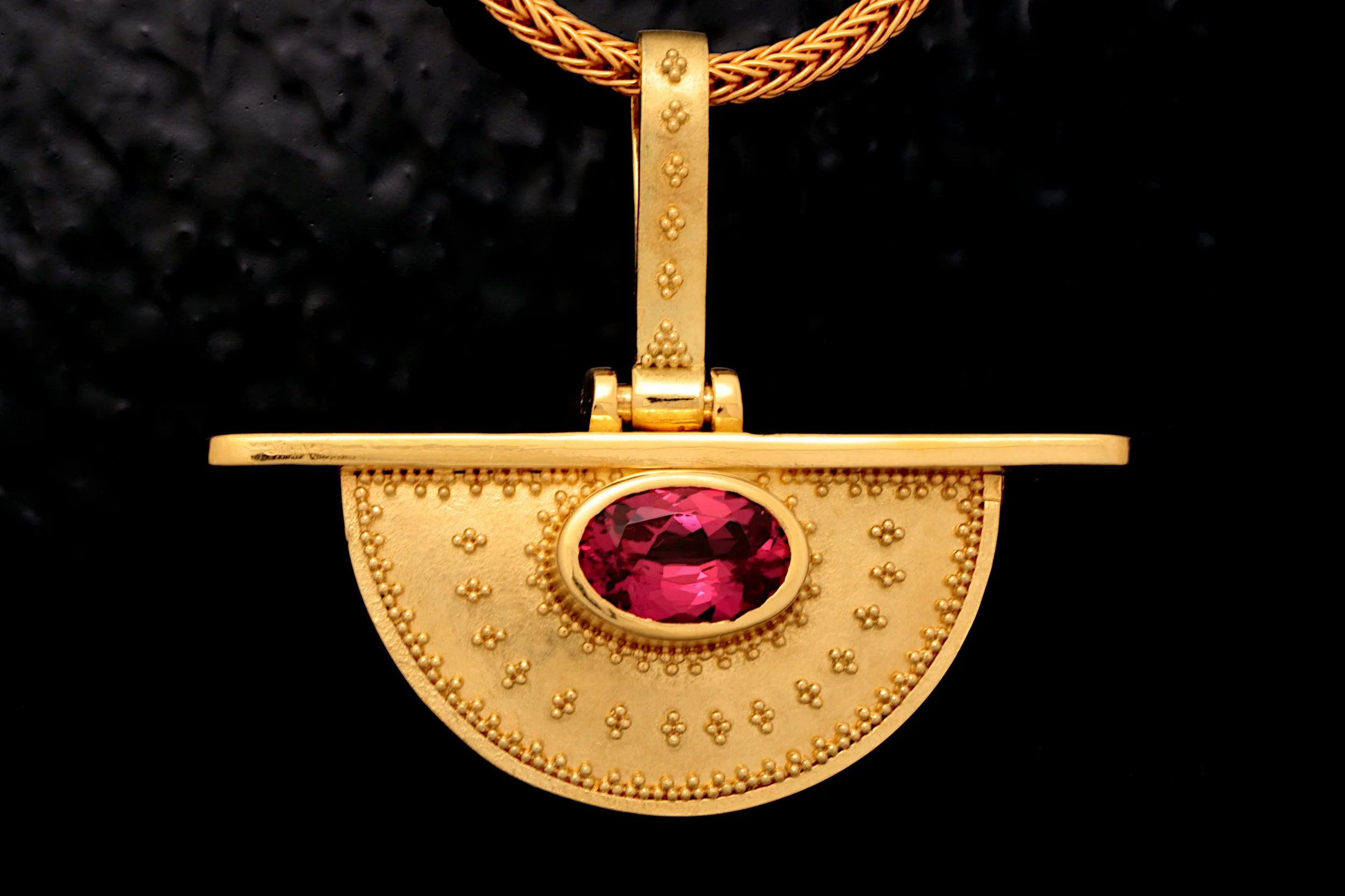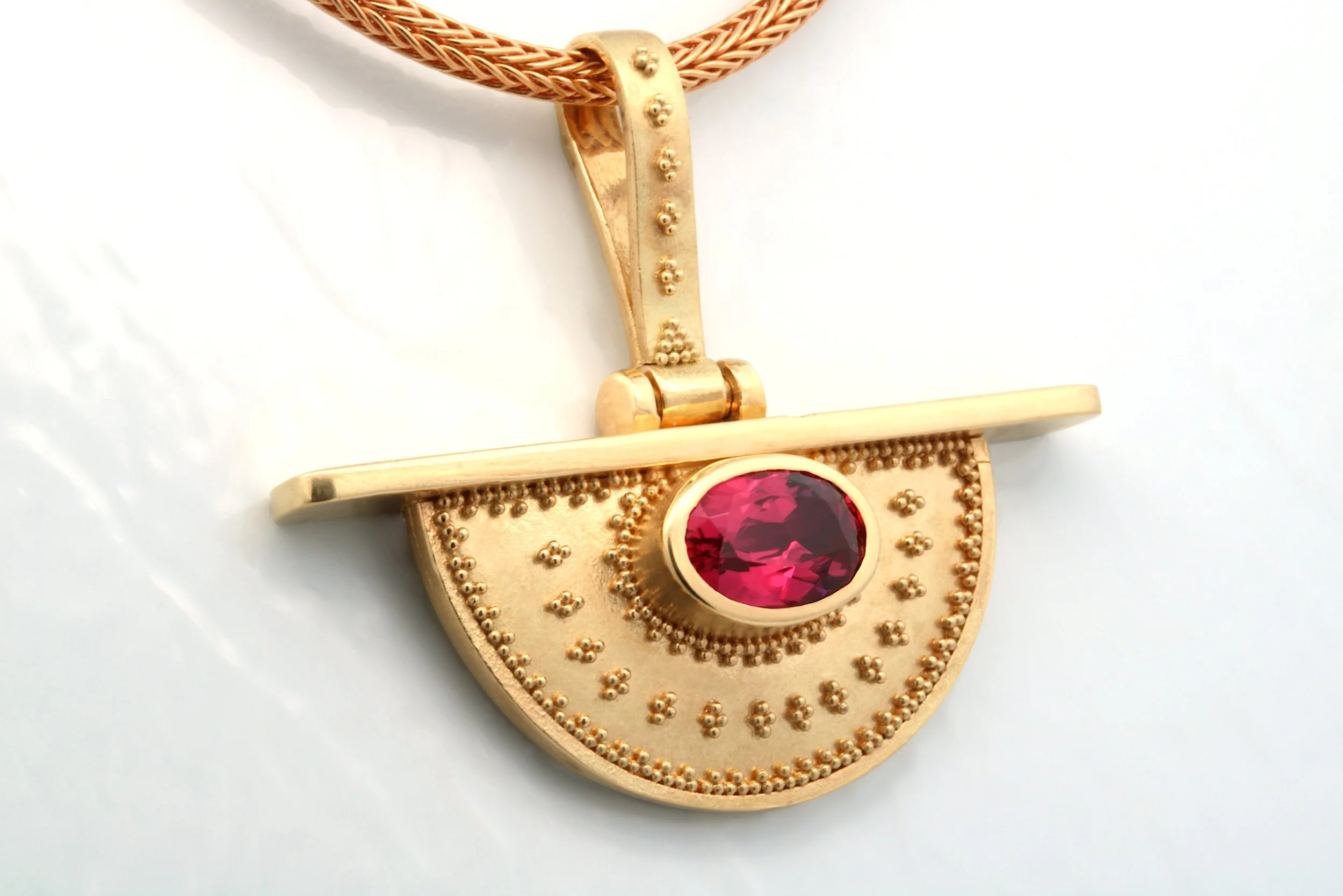 The Radiance pendant is entirely hand-fabricated with meticulous precision. Each wire is carefully rolled and drawn through precision plates to make the gold granules, while the gold sheet is shaped to achieve the perfect balance of strength and fluidity. Individually handcrafted granules add a rich, tactile depth, enhancing the pendant’s luminous texture. At its heart is a striking spinel weighing just over 2 carats.