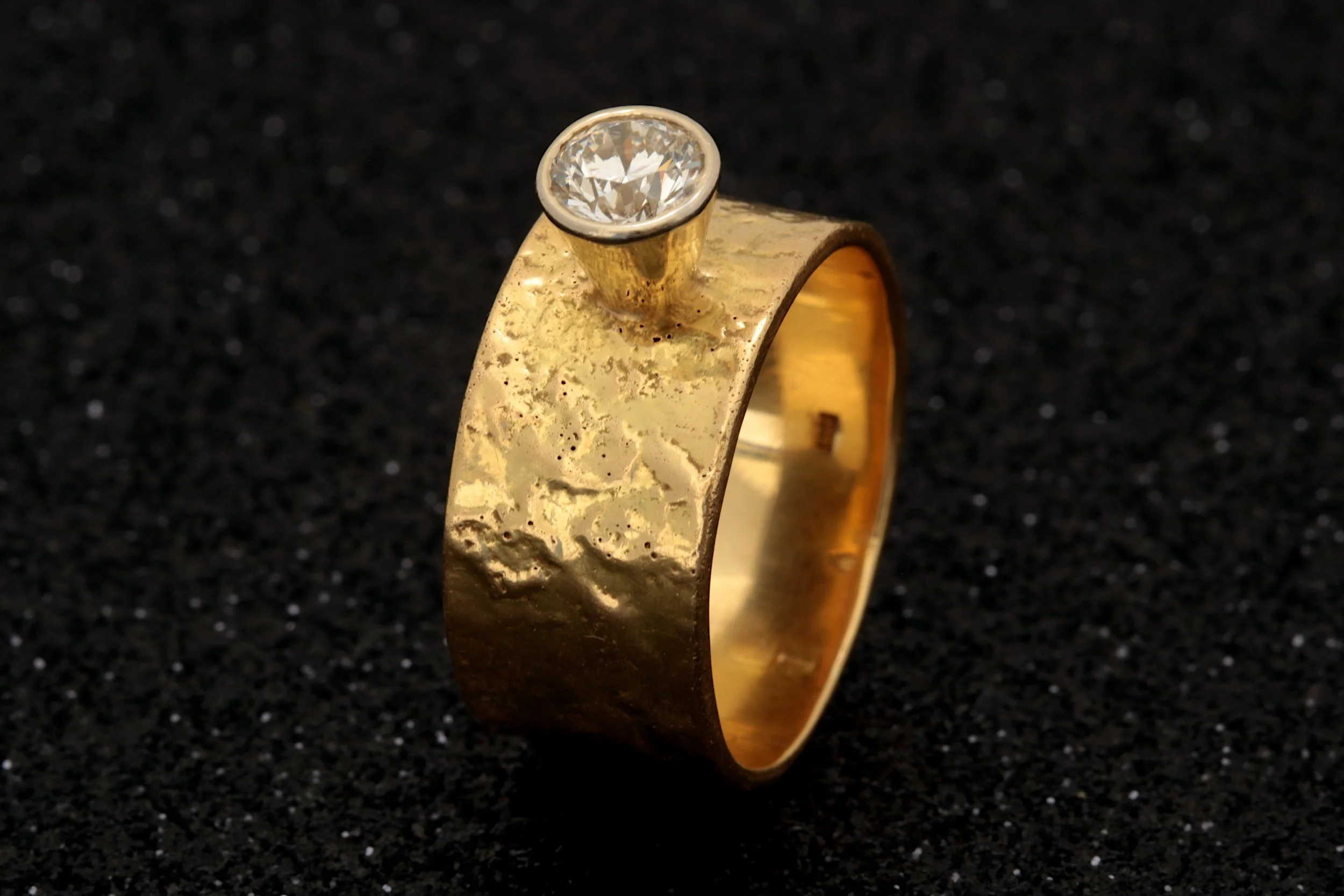This 18-karat gold handmade band features a striking reticulated texture, created through an intricate and specialized process. The ring was repeatedly heated—approximately 22 to 23 times—to develop surface oxides, which were meticulously removed with acid after each cycle. During the final heating, an intense flame caused the underlying gold to partially melt, and as it cooled, it formed the beautifully organic, wrinkled texture you see here.